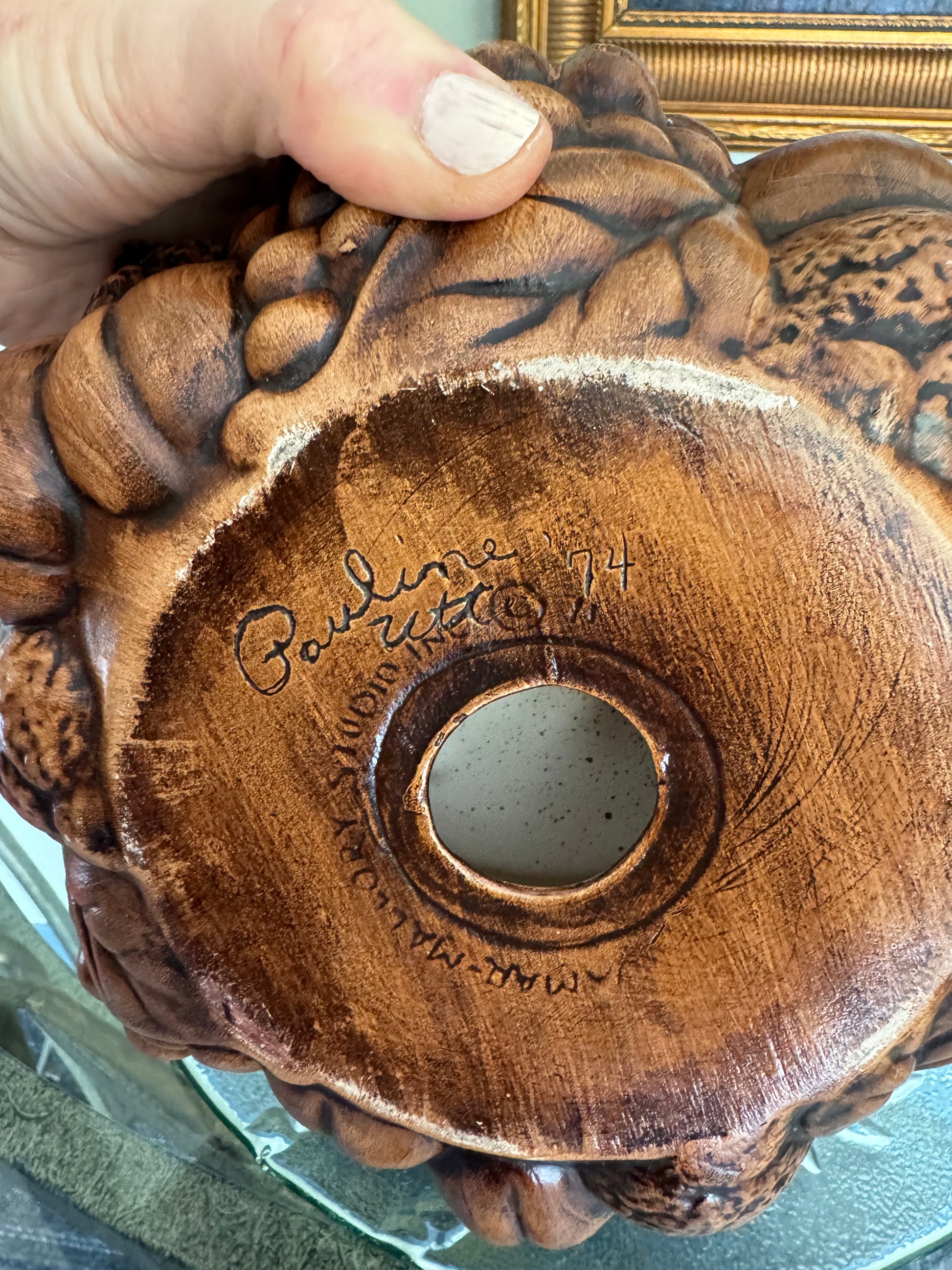 Vintage Ceramic Bowl Ashtray 1974 Signed Jamar Mallory. This handcrafted ceramic piece showcases masterful sculptural work with a grape-and-leaf border rendered in warm brown glazing. Signed and dated 1974 by artisan Jamar Mallory, the hand-carved details and organic form reflect authentic mid-century studio pottery craftsmanship. Versatile in function—display as a decorative centerpiece, use as a catchall for keys and jewelry, or serve as a rustic fruit bowl. The timeless design complements traditional, cottagecore, and Mediterranean interiors,